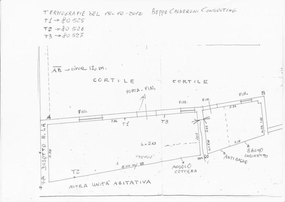 Retrouvez ensuite le plan de la maison avec les points indiqués - indiqués notamment comme "T1", "T2" ET "T3" - où les mesures thermographiques ont été effectuées au moment de l'installation, après 11 mois et après deux ans, dans des conditions conditions climatiques presque identiques.