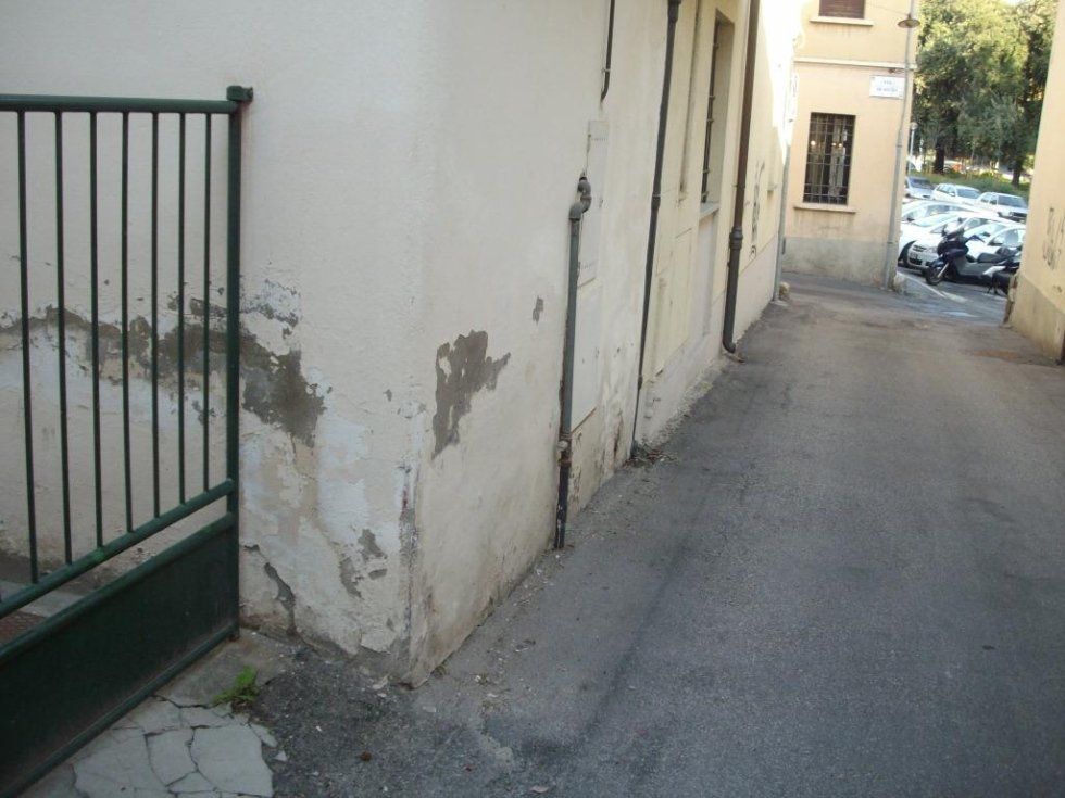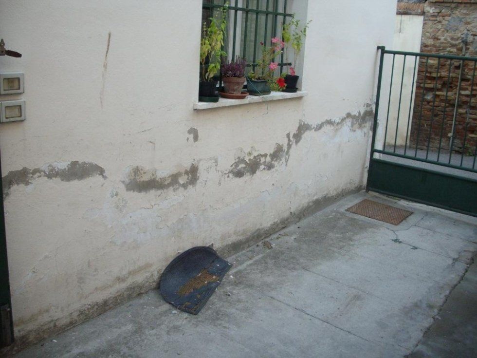 Les premières photos montrent une façade extérieure du bâtiment avant l'installation d'un déshumidificateur électrophysique mural. Vous pouvez voir les signes de remontée d'humidité du plâtre détaché.